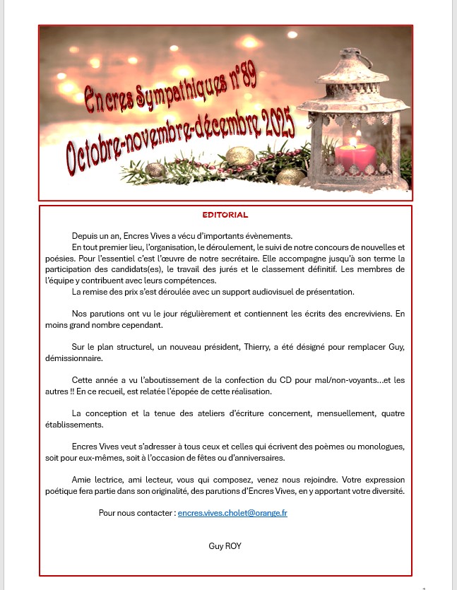 Encres Vives encadre et soutient l'activité de ses adhérents, tous auteurs amateurs et passionnés. L'Association organise des ateliers d'écriture et participe à de nombreuses manifestations culturelles.